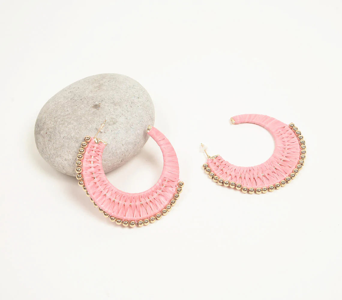 Raffia-Wrapped Iron Coral C-Hoop Earrings