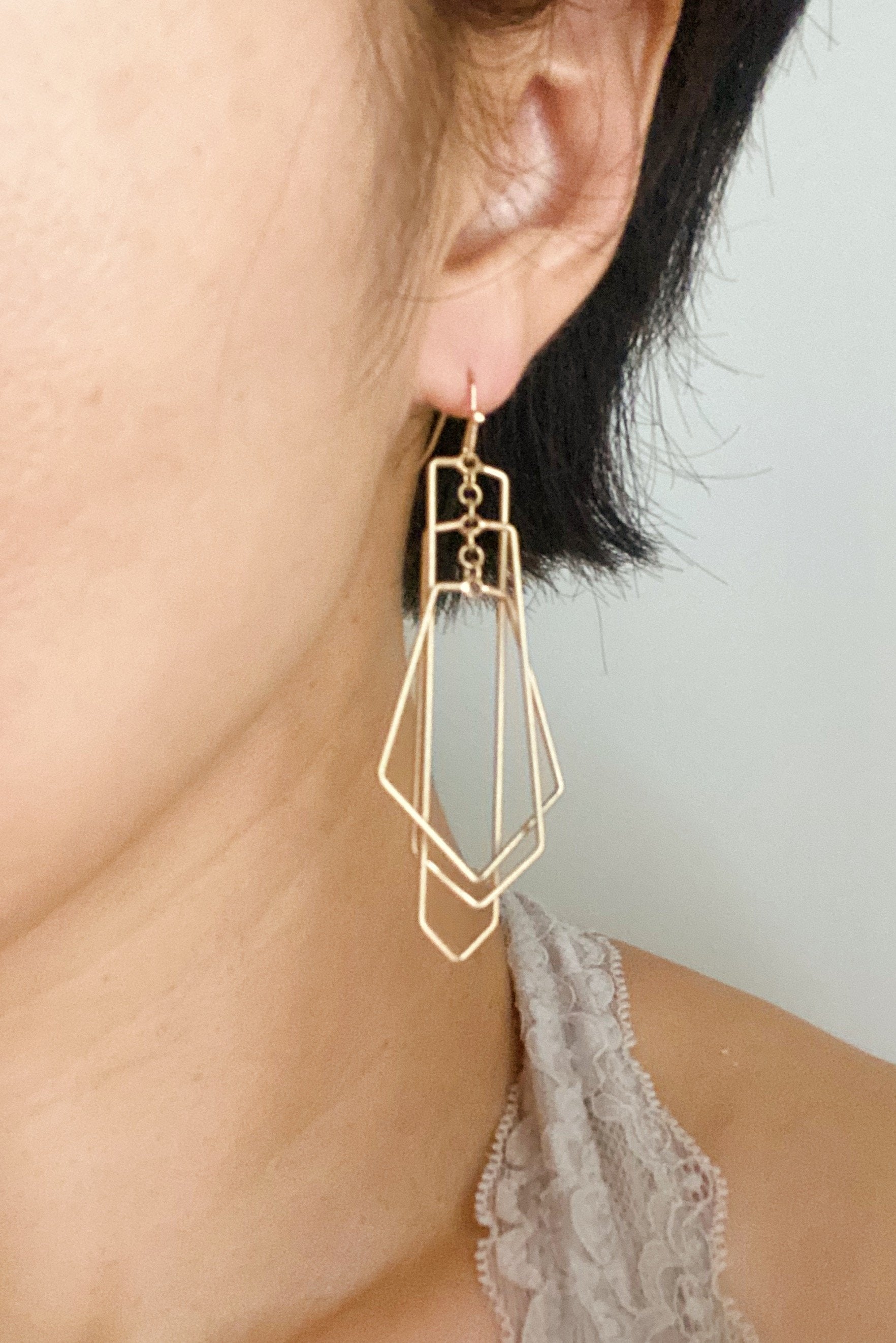 3 different wired shapes dimensionally dangle together. Lightweight Ans worn gold finish.